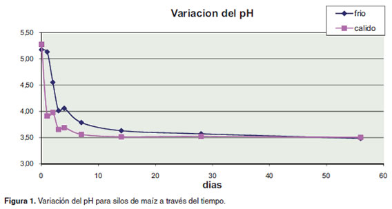 pH a pesar de las condiciones climáticas en las que se desarrolló cada especie forrajera ensilada, el pH fluctuó en un pequeño rango poco variable, siendo consecuente con los resultados de la literatura (Sparo y Mallo, 2001). Así mismo, las condiciones de anaerobiosis, humedad y concentración de carbohidratos fueron adecuadas para que el pH descendiera a un nivel óptimo para la preservación de los silos en ambos tratamientos. De otro lado, posiblemente, la mayor cantidad de azúcares disponibles y la temperatura, para el forraje de clima cálido, permitió un tiempo Lag (de adaptación) más corto y un crecimiento exponencial más rápido, por lo tanto, estas bacterias produjeron mayor cantidad de ácido láctico en menor tiempo, generando una caída mas pronunciada del pH para este tratamiento; esto favorece la calidad del material ensilado, gracias a una mayor velocidad de crecimiento con menor tiempo de duplicación por una mayor actividad metabólica. El pH final obtenido para ambos tratamientos (día 56), fue más bajo que el reportado por la literatura para ensilaje de maíz en Argentina sin la utilización de aditivos, el cual sólo alcanzó un valor de 4.1 después de 50 días de fermentación (Sparo y Mallo, 2001).