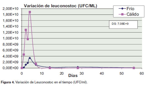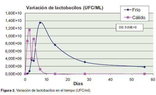 Leuconostoc este género es menos resistente al descenso del pH que los lactobacilos, especialmente por su alta susceptibilidad al ácido láctico en su forma no disociada (McDonald et al., 1990). Por lo tanto, su población comenzó a disminuir mucho más rápido en el tiempo que la de los otros géneros evaluados en ambos tratamientos. Como sucedió para las otras BAL, la reducción poblacional de este género en clima frío fue más lenta por su posibilidad de adaptación al nuevo pH. Este género es el más común en el forraje fresco de alfalfa (Medicago sativa) y el segundo más común en guinea (Panicum maximum) con concentraciones de 7E+05 y 8E+03 UFC/g respectivamente (Cai, 1999), los cuales, a pesar de ser valores mucho mas bajos que los encontrados en el presente estudio, concuerdan en ser la población dominante en ambos tratamientos, ya que este género presentó la mayor concentración de UFC/g en el forraje fresco con respecto al total de las BAL. Varios investigadores han reportado valores iniciales de 8E+06 hasta 5E+07 UFC/g en forraje de maíz (Cai et al., 2003 y Cai et al., 1999a), similares a los valores encontrados en el presente estudio. Este género cumple una importante función inicial en la búsqueda del rápido descenso del pH dentro del silo. Por lo tanto, las altas poblaciones iniciales encontradas en este trabajo, contribuyeron efectivamente, al descenso del pH en sus etapas iniciales reduciendo así las perdidas dentro del silo.