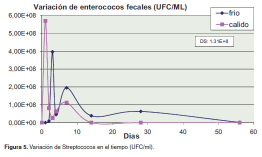 Enterococos. Se encontraron diferencias significativas para la interacción clima*día (p<0.05), indicando que la población de enterococos fue diferente para cada clima a lo largo del tiempo. Aunque las poblaciones iniciales para ambos climas fueron similares, para el día uno, la población de clima cálido fue significativamente mayor que para el frío (p<0.05) (Figura 5).