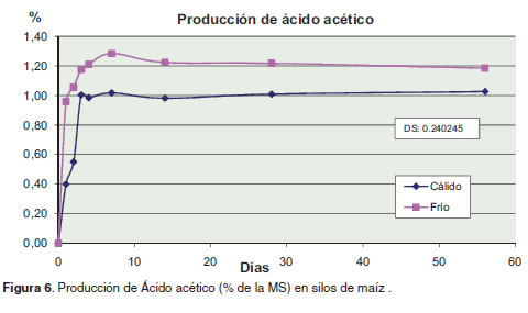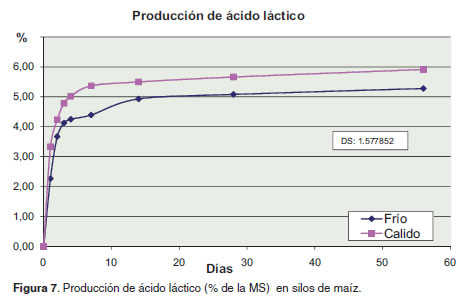 Por otro lado, se han reportado valores de 1.7% de ácido láctico en maíz ensilado a 37 ºC y 2.8% cuando la temperatura de ensilaje fue de 28 ºC (Weinberg et al., 2002), mucho más bajos que los encontrados en este estudio. En una revisión sobre reportes de análisis fermentativos en silos de maíz se reportan valores de ácido láctico que varían desde cuatro hasta 7% de la materia seca (Kung and Shaver, 2001). Los valores de ácido láctico encontrados en el presente trabajo se encuentran dentro de los rangos que presenta la literatura como adecuados y está altamente correlacionada con un buen proceso fermentativo del forraje (Kung and Shaver, 2001 y Schroeder, 2004). Estos valores unidos a la baja producción de ácido acético, confirman el dominio de las bacterias homofermentativas en ambos ensilajes.