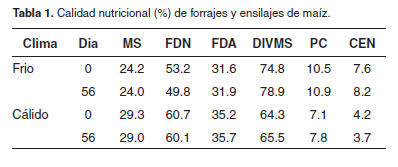 No se presentaron diferencias entre el forraje y el silo al fi nal del proceso en cada clima (Tabla 1). Sin embargo, el maíz de clima cálido presentó menor proteína, digestibilidad, minerales y una mayor concentración de MS, FDN y FDA que el de