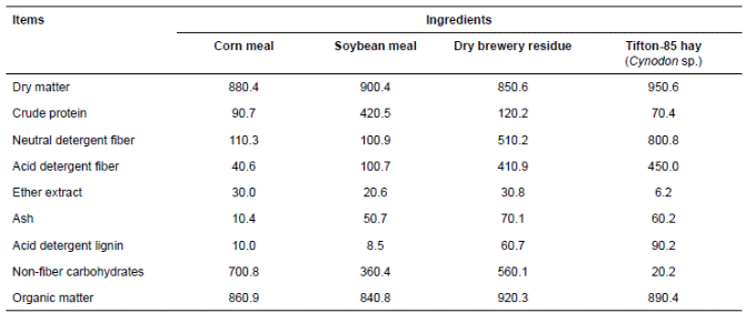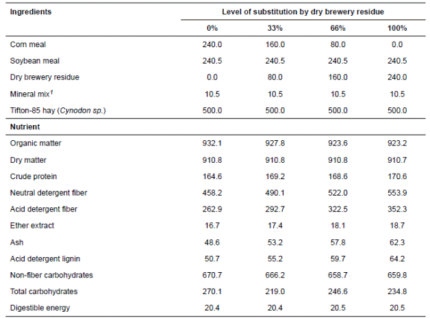 Dietary treatments consisted of 0, 33, 66, and 100% replacement of corn meal with dry brewery residue. Concentrates were formulated with corn meal, soybean meal and dry brewery residue. The forage:concentrate ratio was 50:50, and we used Tifton-85 hay (Cynodon sp.) as forage (Table 1).