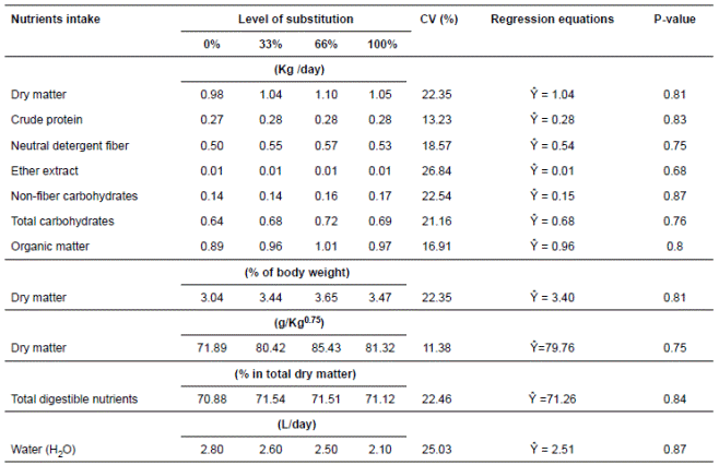 Total and Kg/day dry matter intake, as well as percentage of body weight (g/Kg) of metabolic weight did not change (p>0.05) with the level of dry brewery residue substitution (Table 3).