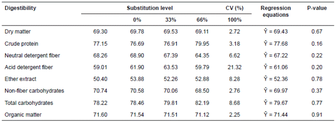 Digestibility coefficients did not change with the inclusion of dry brewery residue. In an experiment with cattle, Geron et al. (2008) observed results similar to those found here: the inclusion of up to 24% brewery residue in the diet did not alter nutrient digestion, ruminal fermentation, nor the efficiency of microbial synthesis. The CP exhibited default behavior with all treatments. Protein composition of dry brewery residue had high values for the B2 and B3 fractions (Pereira et al., 1998) and low ruminal degradability, which together increases amino acid intake in ruminants, especially the intake of essential amino acids.