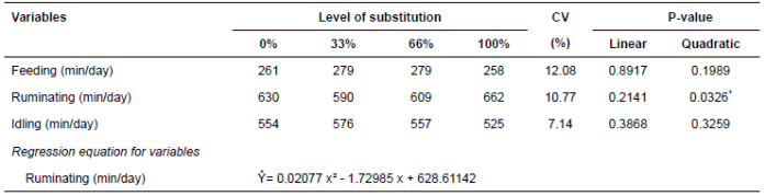 The inclusion of brewery residue in the diets did not affect duration of feeding and idling times (Table 5). However, the ruminating time (min/day) was a quadratic function of the level of substitution (p<0.05). There was a reduction in ruminating time at the 33% substitution level and an increase in ruminating time at the 66 and 100% levels.