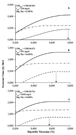 In conclusion, variations on the crystalline amino acid prices slightly affected the optimal economic intake of total sulfur amino acid and Thr. Therefore, considering the cost of DL- methionine and L-threonine at USD $ 3.00/ kg, the optimal total sulfur amino acid intakes to optimize GM was 223, 504 and 975 mg/bird/d, and 236, 696, and 1,042 mg/bird/d for Thr in starter, grower and finisher phases, respectively.