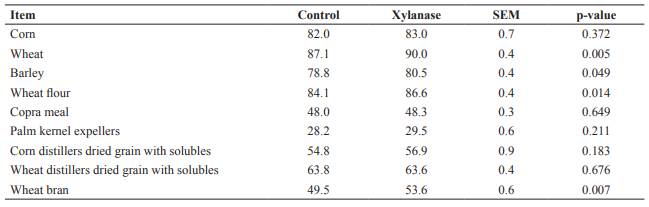 Xylanase addition increased the IVID of DM in wheat, barley, wheat flour, and wheat bran compared with the non-supplemental xylanase group (p<0.05; Table 2).