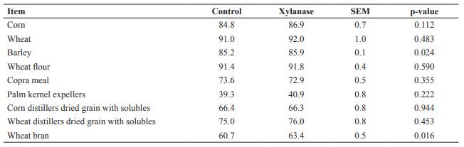 The IVTTD of DM in barley and wheat bran increased by xylanase addition (p<0.05; Table 3). In contrast, supplemental xylanase did not affect IVID and IVTTD of DM in the other ingredients.