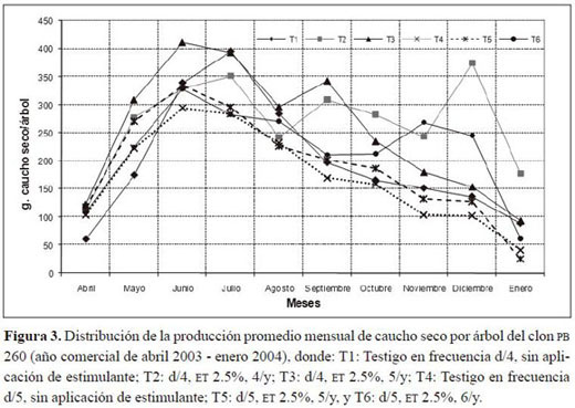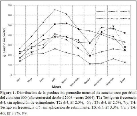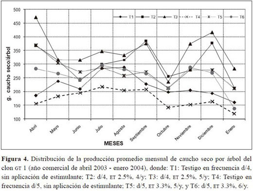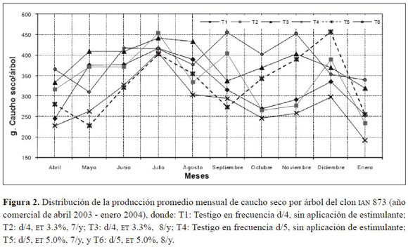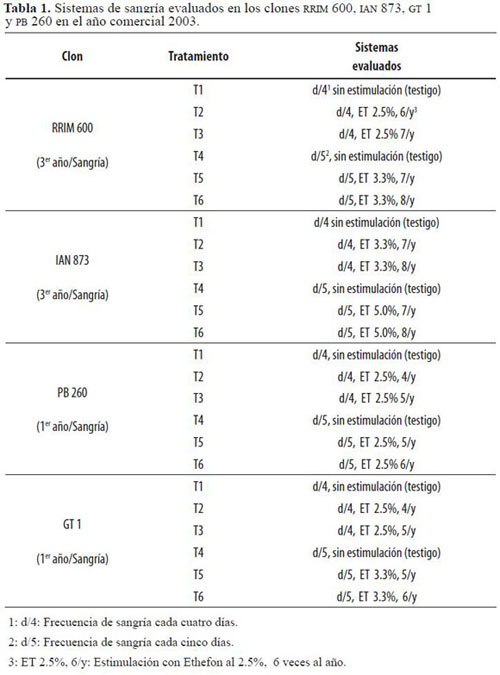 La producción se evaluó en sistemas de sangría con cortes en media espiral (1/2 S), efectuados durante siete días por semana (7d/7) en diez meses del año (10 m /12), variando las frecuencias de sangrado cada cuatro y cinco días (d/4, d/5). Se aplicó solución de agua, Carboximetilcelulosa y Ethel® 48 SL, cada 76, 61, 51, 43 y 38 días, con concentraciones del ingrediente activo de Ethel® en 2.5% y 3.3%, para los clones RRIM 600 y GT 1, concentraciones de 3.3% y 5% para el clon IAN 873 y concentraciones de 2.5% para el clon PB 260. Los tratamientos para cada uno se presentan en la tabla 1. Estos tratamientos fueron seleccionados según las recomendaciones efectuadas por Doree (1998), producto de su investigación en la plantación de la empresa MICHELLIN en Matto Grosso, Brasil.