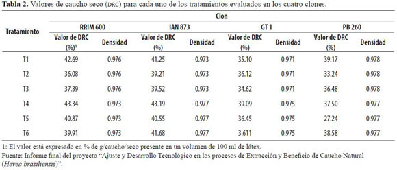 Como el estudio buscaba determinar la producción promedio en g de caucho seco por `árbol (g/caucho/árbol) para los cuatro clones, se llevó a cabo una conversión de los datos de producción (ml/látex/árbol) al valor de caucho seco (g/caucho/árbol) para cada uno de los 960 árboles, utilizando como factores de transformación el contenido de caucho seco (Dry Rubber Content -DRC) y la densidad de látex para cada tratamiento, cuyos valores se presentan en la tabla 2.
