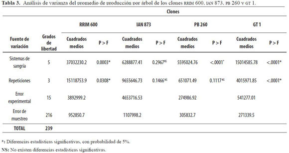 El análisis de varianza del promedio de producción por árbol de los clones RRIM 600, presentó diferencias significativas (Tabla 3).