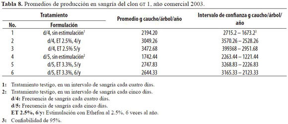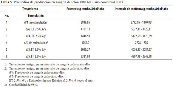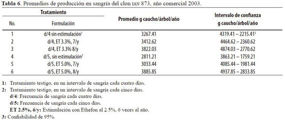De acuerdo con los resultados obtenidos bajo las condiciones de este trabajo se pueden estimar, en un tercer año de sangría, producciones promedio por árbol de 4.5 (± 0.976) kg, con sangría cada cuatro días y siete aplicaciones anuales de estimulante a una concentración de 2.5%, y 3.8 (± 1.052) kg de caucho seco por árbol al año, con sangría cada cuatro días, ocho aplicaciones anuales de estimulante en una concentración de 3.3% para los clones RRIM 600 e IAN 873, respectivamente.