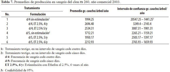 En las condiciones de este estudio se estima, en primer año de sangría, producciones de caucho seco aproximadas de 2.7 (± 0.553) kg/árbol/año, con sangría cada cuatro días y el uso de estimulante cuatro veces por año en una concentración de 2.5%, y 3.5 (± 0.521) kg/árbol/año con sangría cada cuatro días y uso de estimulante cinco veces por año en una concentración de 2.5% para los clones PB 260 y GT 1, respectivamente.