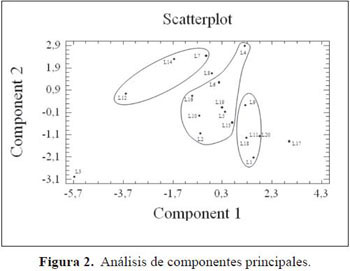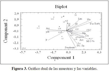 El análisis de componentes principales (PCA) para el ordenamiento de los levantamientos (Figura 2, Tabla 9) define la agrupación de las tres asociaciones en sucesión de la reserva. En el biplot de levantamientos y variables (Figura 3) se observan el contenido de arcilla, el pH y la CIC como las variables más influyentes en el primer componente, mientras que en el segundo componente son más representativas la pendiente y el número de especies. Dos levantamientos del herbazal con Rubus floribumdum y Pteridium aquilinum (L12 y L14) están más relacionados con suelos arcillosos y pobres en nutrientes, mientras que algunos levantamientos de la vegetación dominada por Weinmannia pinnata y Miconia theaezans (L1, L11 y L20), con mayor número de especies, responden azonas de mayor pendiente y a suelos con valores más altos de arena, materia orgánica, calcio y magnesio.