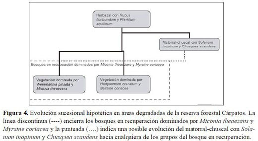 Una primer tendencia de sucesión está hacia el herbazal con Rubus floribundum y Pteridium aquilinum, donde Chusquea scandens, una especie tan agresiva como las de la matriz de gramíneas, puede hacer muy lento el proceso de sucesión o detenerlo por un largo tiempo. Otra tendencia se identifica en los bosques dominados por Miconia theaezans y Myrsine coriacea, como la base sobre la cual se estructurará una vegetación más compleja. Como es característico en las etapas priserales, dicha sere posee una baja diversidad de especies, pero el gran rango de adaptación de éstas permite generar condiciones apropiadas para la llegada de nuevas especies. Dos tipos de vegetación hacen parte de este grupo: los dominados por Hedyosmum crenatum y Myrsine coriacea, cuyas especies hacen parte del bosque natural intervenido (Cantillo et al. 2005), pudiendo incluso encontrarse en las zonas de los bordes, con características más sociales y como indicadores de mayor humedad. De igual forma, estas especies se caracterizan por su gremio ecológico hemisciófito (Lamprecht 1990) y aunque no poseen grandes poblaciones, su constancia y su dominancia las convierten en especies importantes en zonas intermedias de la sucesión como gestores de comunidades más evolucionadas; los dominados por Weinmannia pinnata y Miconia theaezans (Cantillo et al. 2005), que si bien guardan similitud con la anterior en cuanto a complejidad estructural, se convierten en una comunidad más avanzada en la evolución al contener especies importantes de estos bosques altoandinos, como es el caso de Ocotea calophylla. Una síntesis se observa en la figura 4.