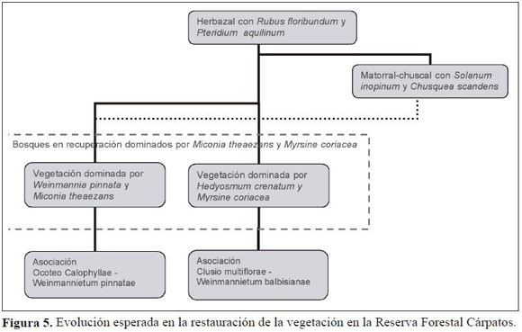 La composición florística y las características estructurales de las asociaciones presentes en el proceso sucesional determinan no sólo los nuevos caminos de evolución de este proceso, sino las características y formas de distribución regional. La evolución de las asociaciones en la Reserva Forestal Cárpatos se mantiene a través del cambio constante de la diversidad de especies. Se espera que la acción compartida de especies dinamizadoras como Weinmannia pinnata, Miconia theaezans y Myrsine coriacea y el azar del proceso determinen el futuro de asociaciones más avanzadas como Ocoteo calophyllae-Weinmannietum pinnatae o Clusio multiflorae-Weinmannietum balbisianae, caracterizadas en el bosque más antiguo (Cantillo et al. 2005). Lo anterior puede clarificarse de acuerdo con el proceso mostrado en la figura 5.