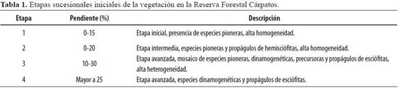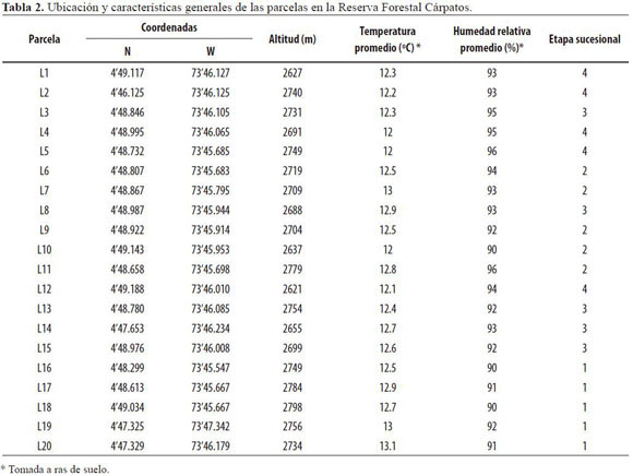 Fase de campo. Para la caracterización de etapas sucesionales de manera sincrónica, se diferenciaron cuatro estados, de acuerdo con el desarrollo de la vegetación presente en los parches (Tabla 1) y se establecieron en diferentes puntos de la reserva 20 parcelas de 6 m x 6 m, cinco por cada etapa, para un total de 720 m2 de área muestreada (Tabla 2). Se tomaron datos de altura total y diámetro de cada uno de los individuos (brinzales, latizales o latizales establecidos) y una muestra para identificación botánica. Se registraron lecturas secuenciales de la humedad relativa y temperatura media para cada una de las parcelas utilizando un termohigrómetro. Se calculó para cada parcela el grado de inclinación (pendiente) utilizando para ello un nivel Abney. Se tomó una muestra de suelo por cada una de las parcelas para analizar propiedades físicas, como la textura y la porosidad total, y químicas, como pH, cationes de cambio (Ca, Mg, K, Na), saturaciones (ST, SCa, SMg, SK, Al), CIC, materia orgánica y elementos menores (hierro, cobre, manganeso, zinc, boro, fósforo y azufre).