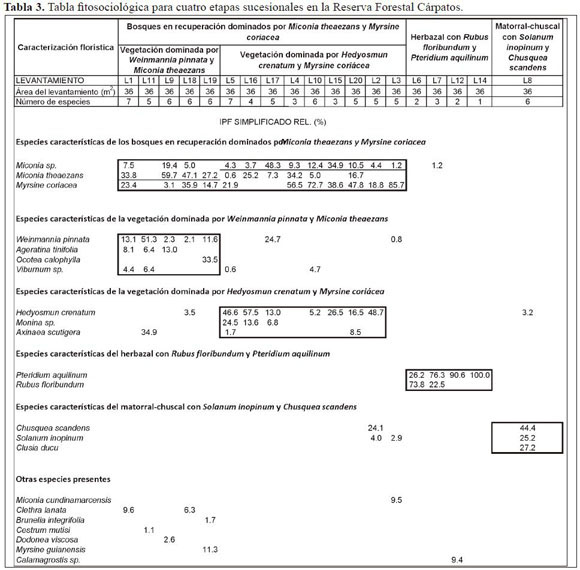 Con el análisis de las variables estructurales explicadas se pudo definir la importancia que reviste cada especie en cada una de las etapas de desarrollo. El predominio ecológico de biotipos menos es pecíficos y más adaptables en etapas iniciales del proceso sucesional se debe a su amplia capacidad de adaptación a las perturbaciones y a la gran capacidad de incrementar su biomasa superficial y subterránea en periodos cortos de tiempo y en amplios espacios. Este patrón demuestra la tendencia de esta parte del sistema hacia la heterogeneidad. Por tal razón, las especies que revistieron mayor importancia en las seres iniciales fueron aquellas con amplia posibilidad de propagación como Pteridium aquilinum y Rubus floribundum, que disminuyeron su presencia en seres más avanzadas.
