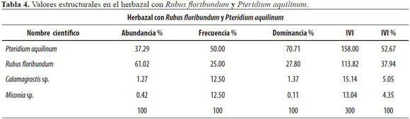 Las especies dominantes son Rubus floribundum y Pteridium aquilinum.