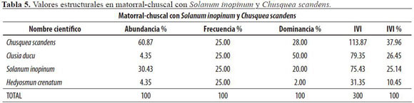 Matorral caracterizado por un estrato arbustivo con altura menor a 3 m, dominado por Clusia ducu con 50%. Aunque Chusquea scandens muestra una dominancia menor con 28%, es la especie de mayor IVI (38%) por su mayor abundancia (61%), seguida de Clusia ducu con 26% (Tabla 5). Contiene un promedio estimado de 638 individuos por 0.1 ha y un total de cuatro especies, cuatro géneros y cuatro familias.
