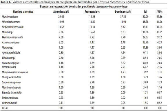 Las especies dominantes son Miconia theaezans y Myrsine coriacea.