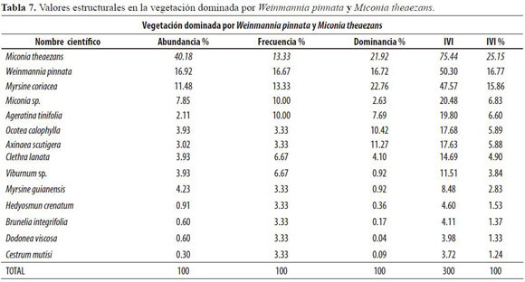 Miconia theaezans con 22% y Weinmannia pinnata con 17%. Miconia theaezans contiene el mayor IVI (25%) por su mayor abundancia (40%), seguida de Weinmannia pinnata con 17% y Myrsine coriacea con 16% (Tabla 7). Contiene un promedio estimado de 1833 individuos por 0.1 ha y un total de 14 especies, 12 géneros y 11 familias (Tabla 7).