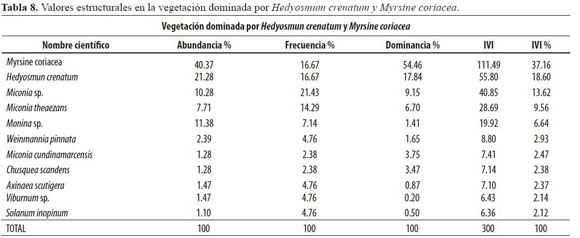 Vegetación dominada por un estrato arbustivo con altura menor a 5 m. La especie dominante fue Myrsine coriacea, al presentar un área basal relativa de 37%, abundancia de 29% y el mayor IVI, con 27%. Le siguen en importancia Miconia theaezans, con 16% de IVI, y Hedyosmun crenatum, con 11% (Tabla 6). Contiene un promedio estimado de 1742 individuos por 0.1 ha y un total de 18 especies, 16 géneros y 13 familias.