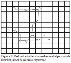 Una vez establecida la red de caminos de costo mínimo que comunicaban los diferentes patios, se procedió a calcular el árbol de mínima expansión mediante el algoritmo de Kruskal, en la red G [N,A], conexa con n vértices y m aristas. De esta forma, quedó establecida la red con mínimo costo que comunicó todos los patios mediante una vía de evacuación (Figura 9).