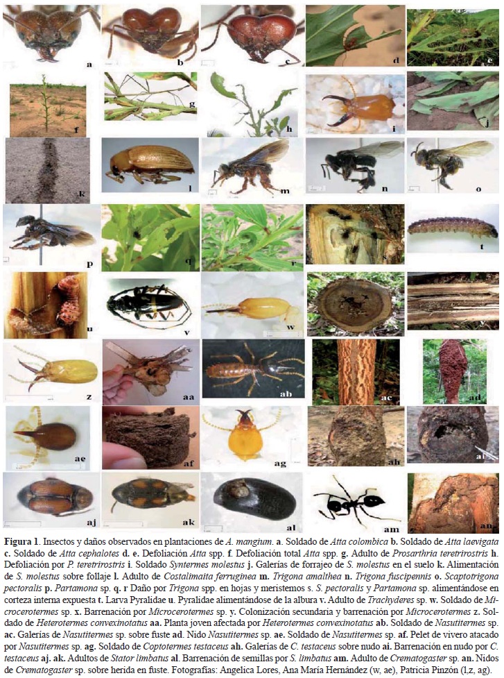 Las termitas son considerados una de las mayores plagas de importancia económica en plantaciones de A. mangium en el sudeste asiático (Kirton & Brown 1999, Nair 2000). En plantaciones recién establecidas de la Orinoquia, Heterotermes y Nasutitermes se han asociado con daños y mortalidad de plántulas, pero no se ha establecido aun la magnitud de los ataques; Heterotermes es asociado con daños en plantaciones de eucaliptos, en la Orinoquia (Nieto & Gasca 2010) y en la Costa Atlántica (Madrigal 1989). En plantaciones de mayor desarrollo (2 años), también llaman la atención los ataques de Coptotermes en las plantaciones de la Orinoquia por las características del daño y por la reconocida actividad dañina de especies de este género en plantaciones forestales de varias especies incluida Acacia mangium, las cuales, al parecer, están relacionadas con la ocurrencia de heridas que exponen el xilema al taque de termitas (Kirton & Brown 1999). En las plantaciones de la Costa Atlántica, no se observaron daños por Coptotermes, aun cuando se conoce de la ocurrencia de poblaciones de Coptotermes testaceus y se atribuyen daños en cultivos forestales y frutales (Abadia & Arcila 2009, Gutierrez et al. 2004). Es de anotar que en la Costa Atlántica no se implementaron técnicas de muestreo específicas para detectar ataques de termitas subterráneas.