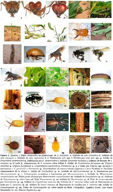 Foram identificados insetos atual ou potencialmente daninhos e se caracterizaram pelos danos que ocasionam a raiz, folhagem e sementes das árvores em plantações comerciais de Acácia mangium Willd., localizadas em núcleos florestais dos departamentos de Córdoba e Meta priorizando lotes com antecedentes de problemas fitossanitários.As observações apresentadas se realizaram em parcelas fixas e em percorridos gerais nas plantações, em épocas de chuvas e em períodos secos. Foram registrados 27especies daninhas na folhagem, raiz e sementes. Também dos ataques por Atta spp., não se registraram afetações de importância econômica. Contudo as infestações de Xyleborus e Teloplatypus causam preocupação pelas conseqüências de seus danos.