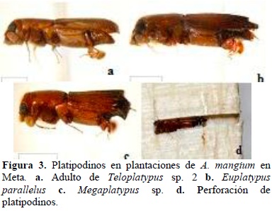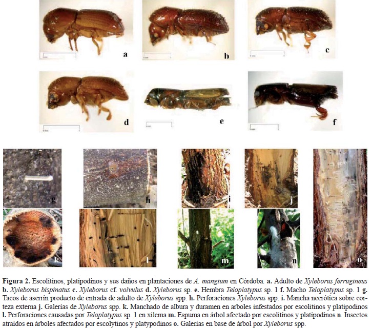 Varias especies de insectos ambrosiales incluidas especies de Xyleborus son relacionados en la literatura con la inoculación y la diseminación de hongos fitopatógenos vasculares como Ceratocystis sp., los cuales, además de producir manchados en la madera, pueden causar la muerte súbita de árboles. (Gil et al. 2004, Tarigan et al. 2011). Daños causados por varias especies de escolítidos y platipodidos se registran en plantaciones de A. mangium en Colombia en el departamento de Antioquia (Lara 2001), en Costa Rica y en Brasil (Do Rosario 2009), como también en el sudeste asiático (Nair 2000) causando daños principalmente en ramas, plantas de vivero y barrenación de fustes registradas como plagas de importancia económica. De acuerdo con las observaciones realizadas, la incidencia de estas especies es baja en el momento (inferior al 5%), pero debido a que se desconocen los factores que ocasionan su desarrollo y el futuro comportamiento estas especies merecen mayor atención. En Córdoba, los daños ocasionados por platipodinos se encontraron siempre en árboles afectados por escolitinos, pero no se pudo establecer cuál de los dos insectos inicia el daño; sin embargo, en todas las oportunidades las poblaciones de escolitinos superaban marcadamente la de los platipodinos. También es necesario considerar que, en algunos casos, la ocurrencia de estas infestaciones coincide con el desarrollo de síntomas enfermedades en el fuste y cuyo agente causal es motivo de estudio.
