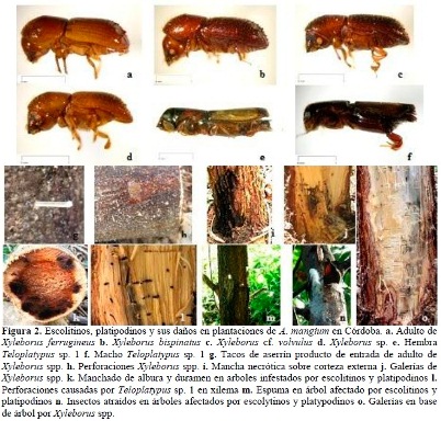 Se encontró un complejo de, por lo menos, cuatro especies del género Xyleborus perforando el fuste en las plantaciones de Córdoba (Figuras 2a, 2b, 2c, 2d). El daño se detecta inicialmente por perforaciones en la corteza externa que también compromete la albura, con presencia de manchado (Figura 2k), posiblemente, producto de los hongos asociados a su actividad de alimentación, por lo que se conocen como insectos de ambrosia.