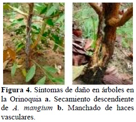 En las plantaciones de Córdoba, es clara la ocurrencia de manchado de los haces vasculares del árbol, posterior a la colonización por escolitinos, mientras que en las plantaciones de la Orinoquia se viene observando el secamiento descendente de arboles aproximadamente un año de edad, en los cuales se observa manchado de los haces vasculares localizado en un lado del árbol, pero aún no se ha establecido su asociación con insectos ambrosiales (Figuras 4a y 4ab). Los síntomas observados en la Orinoquia corresponden a la muerte súbita de arboles por ataques de Ceratocystis manginecans and C. acaciivora sp. nov. reportados recientemente en Indonesia (Tarigan et al. 2011). Tanto en Córdoba como en el Meta es común la práctica de podas en ramas basales del árbol, previo a la ocurrencia de los ataques y muerte de los arboles; por lo tanto, otro factor que requiere inmediata atención es la optimización del tipo de podas, época del año en la cual se deben realizar y tratamiento profiláctico para evitar la colonización por patógenos (Lee 2004). Adicionalmente, es necesario profundizar en el posible papel de los insectos ambrosiales o insectos que se atraen a la savia de los árboles en la inoculación y dispersión de patógenos vasculares (Heath et al. 2009).