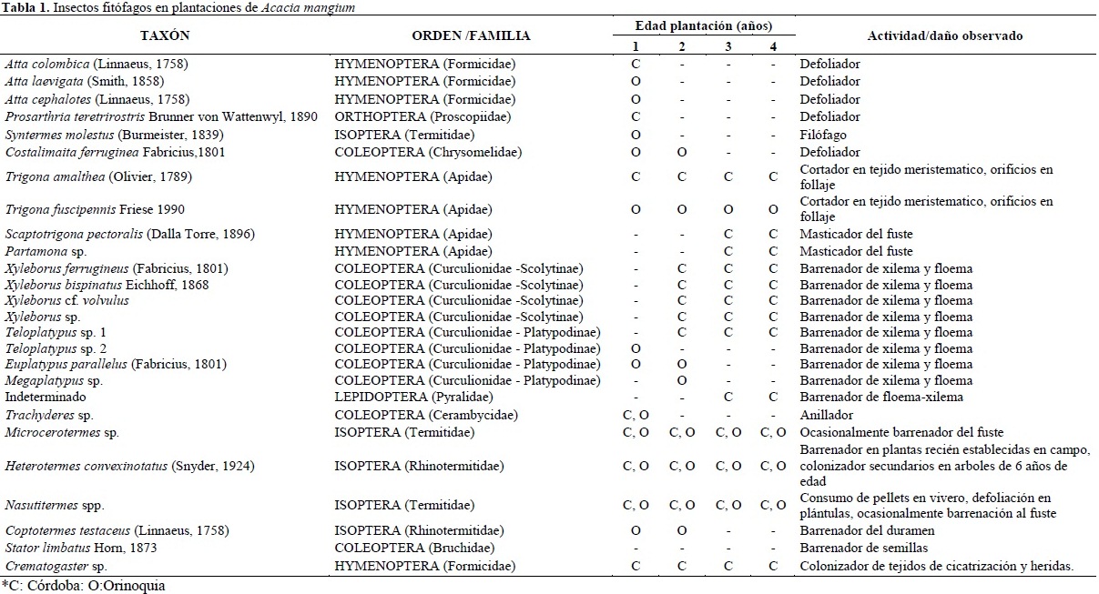 Phytophagous insects in commercial plantations of Acacia mangium Willd. on the Atlantic coast and eastern plains of Colombia