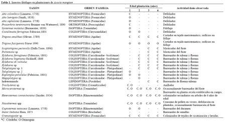 Tomando en consideración las consecuencias de los daños observados después del periodo de establecimiento, la entomofauna de mayor importancia está compuesta principalmente por las especies que afectan el fuste del árbol, los cuales corresponden a barrenadores del orden Coleoptera e Isoptera. Se considera que los géneros Xyleborus y Teloplatypus causan los ataques potencialmente más limitantes en el caso en que estos adquieran dimensiones epidémicas, ya que pueden comprometer la vida del árbol y, además, afectan las propiedades físicas y mecánicas de la madera al causar perforaciones (Burgos& Salcedo 1983, Lombardero& Fernández 1997, Madrigal 2003). Estas especies pertenecen al grupo de insectos conocidos como insectos ambrosiales o diseminadores, debido a que se alimentan de un hongo que inoculan en las galerías de alimentación, el cual causa la coloración oscura de las galerías.