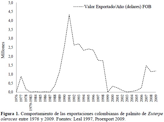 De acuerdo con los registros de Proexport (2009), el valor FOB de las exportaciones de palmito en Colombia sumó entre el 2004 y 2009 USD 4 181 000. En la figura 1 se aprecia la variación de las exportaciones de palmito de naidí desde 1976 hasta la fecha, incluida la época de crisis cuando quebraron todas las empresas del Pacífico. La mercancía que llega a Bogotá para surtir el mercado nacional, puede ser almacenada por un periodo máximo de tres años a temperatura ambiente libre de humedad (~20°C), mientras que la que llega a Buenaventura no, debido al rápido proceso de oxidación de las latas. A pesar de esto, Corpocampo realiza dos tipos de control en Bogotá: uno visual para verificar que las etiquetas estén en buen estado y que las latas no tengan abolladuras y para detectar problemas del contenido cuando se trata de frascos de vidrio (por ejemplo,color o apariencia extraña del palmito); y un segundo control más específico, que se hace de forma aleatoria y con cierta periodicidad sobre algunas cajas, consistente en hacer pruebas de tipo microbiológico, bacteriológico y estérico comercial. Para la mercancía que llega directamente a Buenaventura las pruebas de calidad son realizadas por una firma independiente antes de ser enviada al exterior.