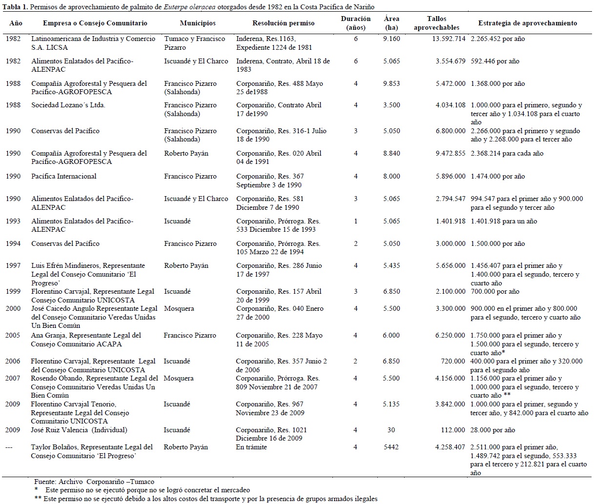 Los planes de manejo otorgados por Corponariño desde 1982 cubren un área de 46998 ha (Tabla 1) del área fluviomarina desde Francisco Pizarro (Salahonda) hasta Santa Bárbara de Iscuandé en Nariño, y contemplan aspectos legales del área de aprovechamiento (estado y calidad jurídica), silvícolas (distribución y hábitos de crecimiento del naidí, flora asociada, tipificación de bosques por geoformas y coberturas vegetales, densidades poblacionales por tipo de bosque), tecnológicos (métodos de corte, extracción, transporte y procesamiento, infraestructura), ecológicos (variables climáticas, tipo de suelo, fauna asociada) y socioeconómicos (relaciones de producción, tendencias del mercado), así como planes de investigación y de reforestaciones futuras (Alenpac 1982, 1990, 1992, 1993, 1995, Licsa 1982, Lozano 1988, 1996, Agrofopesca 1990, Conservas del Pacífico 1990, Corponariño s.f., Pacífica Internacional 1990, Consejo Comunitario El Progreso 1997, Consejo Comunitario Veredas Unidas Un Bien Común 1998).