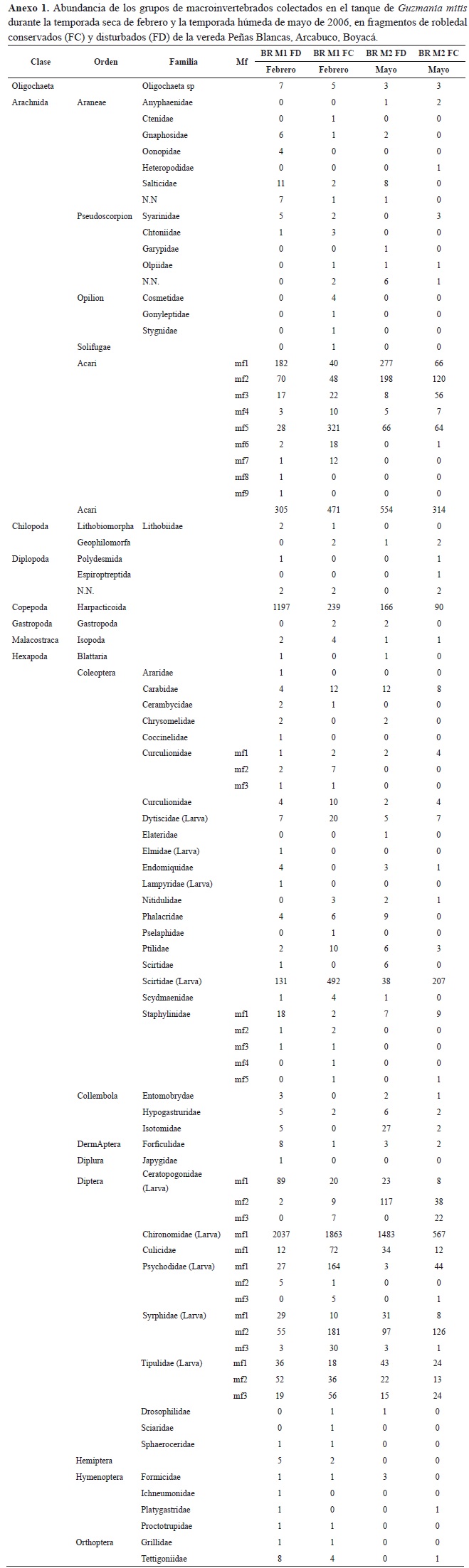 Se estudió la composición y la abundancia de macroinvertebrados asociados a la bromelia terrestre Guzmania mitis en dos fragmentos de robledal con diferente estado de conservación en Arcabuco, Boyacá, con el objetivo de establecer si existen diferencias en la composición y en la abundancia de macroinvertebrados entre los fragmentos y analizar sus posibles causas, y con el fin de identificar grupos de macroinvertebrados que puedan servir de indicadores de alteración de los robledales. En dos fragmentos de robledales diferentes fisionómica y estructuralmente se hicieron dos muestreos de macroinvertebrados en la temporada seca, febrero, y en la temporada lluviosa, mayo del 2006. En cada muestreo se colectaron nueve bromelias por fragmento, de ellas se separaron e identificaron los macroinvertebrados presentes basados en una variante del método de lavado de las bromelias con agua. Se encontraron 12 258 individuos, pertenecientes a 20 órdenes, 52 familias y 89 morfoespecies, destacándose los órdenes Díptera y Coleóptera en estados larvales. Los análisis de agrupamiento en el fragmento disturbado asociaron las bromelias por la mayor abundancia de Chironomidae y baja abundancia de Scirtidae, mientras que en el fragmento conservado, los agrupamientos se dieron por la baja abundancia de Chironomidae y la alta abundancia de Scirtidae. No se halló una relación significativa entre la abundancia, diversidad (Shannon) y riqueza (Margalef) con la variación de los parámetros fisicoquímicos (O2 disuelto y pH), medidos en las bromelias. Las familias Chironomidae y Scirtidae se proponen como posibles indicadores del grado de intervención en los robledales estudiados.