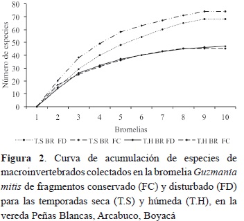 En la figura 2 se observa que el número de especies de macroinvertebrados aumentó rápidamente en los primeros censos y se estabilizó al acumular más bromelias, indicando que el número de bromelias utilizadas en este trabajo fue suficiente para caracterizar la comunidad de macroinvertebrados presentes en ellas, tanto por época de muestreo como por tipo de fragmento. En la temporada seca de febrero de 2006, primer muestreo, se observó que tanto el fragmento conservado como el disturbado presentaron una mayor riqueza de especies en comparación con la época lluviosa de mayo de 2006, segundo muestreo.