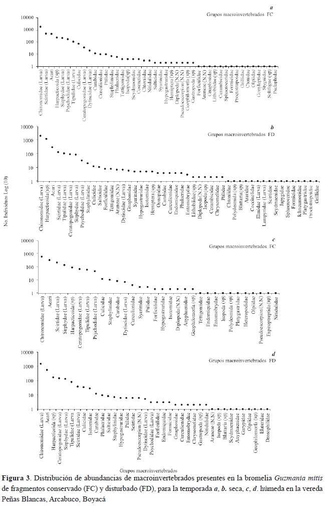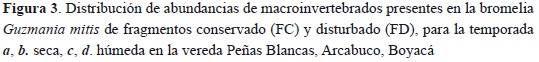 La distribución de abundancias en la figura 3 muestra variaciones en los fragmentos y en los periodos muestreados. En general, las abundancias de macroinvertebrados entre los fragmentos y épocas siguieron la misma distribución, salvo una tendencia a la reducción en la abundancia y riqueza de familias en la temporada lluviosa en ambos fragmentos. El tipo de gráfica se ajusta a una distribución de log N (Magurran, 1989; Moreno, 2001), donde los grupos de macroinvertebrados conforman una comunidad especializada y estable (Moreno, 2001), de acuerdo con los diferentes recursos ofertados por las bromelias, principalmente los productos que se derivan de la hojarasca como partículas de materia orgánica gruesa (PMOG), materia orgánica disuelta (MOD) y partículas de materia orgánica fina (PMOF; Kitching, 2000).