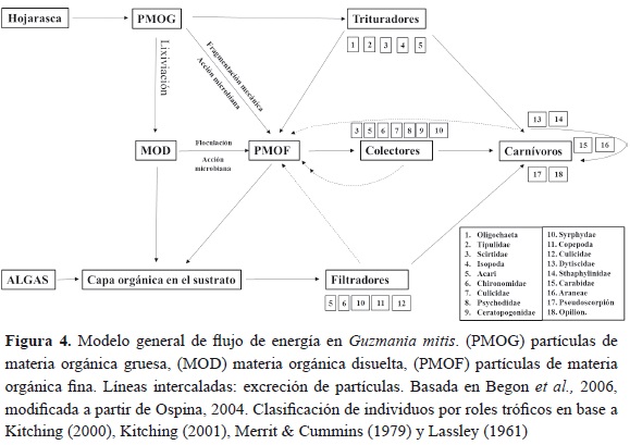 Al encontrar grupos especializados en cada uno de los niveles de descomposición de la hojarasca en Guzmania mitis, notamos que las comunidades de ambos fragmentos contienen especies en todos los niveles tróficos en el esquema del flujo de energía dentro del tanque de las bromelia, donde una fracción de partículas de materia orgánica gruesa (PMOG) proveniente de la hojarasca es transformada por lixiviación en materia orgánica disuelta (MOD), el remanente es entonces procesado a partículas de materia orgánica fina (PMOF) de tres maneras diferentes, fraccionamiento mecánico, fragmentación por degradación de microorganismos y fragmentación por trituradores; adicionalmente, todos los grupos de animales contribuyen con la formación de PMOF por medio de la producción de heces (Begon et al., 2006). Por último, se encuentran los depredadores que pueden disponer como alimento a cualquiera de los grupos presentes en la red trófica (figura 4).