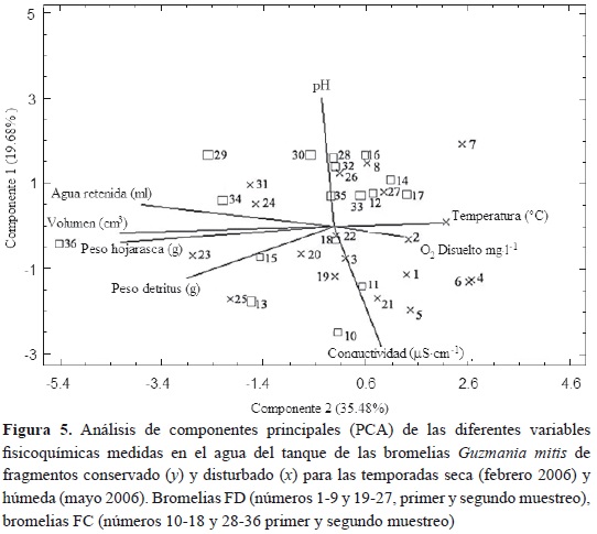 Se realizó un análisis de componentes principales (PCA) para correlacionar la abundancia de macroinvertebrados acuáticos en las bromelias con los parámetros fisicoquímicos medidos con el fin de establecer si alguna variable agrupaba las especies de alguno de los fragmentos y épocas de muestreo. Finalmente se realizó una gráfica de dispersión de especies con la abundancia absoluta para determinar la estructura de las comunidades existentes en las bromelias y con la interpretación biológica del modelo al que representan en cada uno de los fragmentos de bosque y época de muestreo.