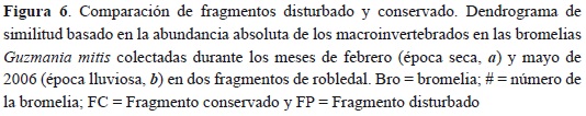 Los dendrogramas de similitud de la abundancia de macroinvertebrados entre bromelias de los dos fragmentos muestran una separación de las bromelias, dependiendo del lugar donde se encuentren, resultados que concuerdan con los de De Lyra (2006), donde la fragmentación del ecosistema ocasiona apertura de claros y simplificación de la vegetación, generando cambios o disminución en las poblaciones de las comunidades de macroinvertebrados. La separación de las bromelias estuvo regida, principalmente, por un alto o bajo número de dos de las familias más abundantes; la mayor abundancia de las larvas de la familia Chironomidae estuvo asociada al FD, mientras que una mayor abundancia de larvas de la familia Scirtidae estuvo ligado al FC, mostrando así que algunas familias son sensibles al grado de disturbio (De Lyra, 2006).