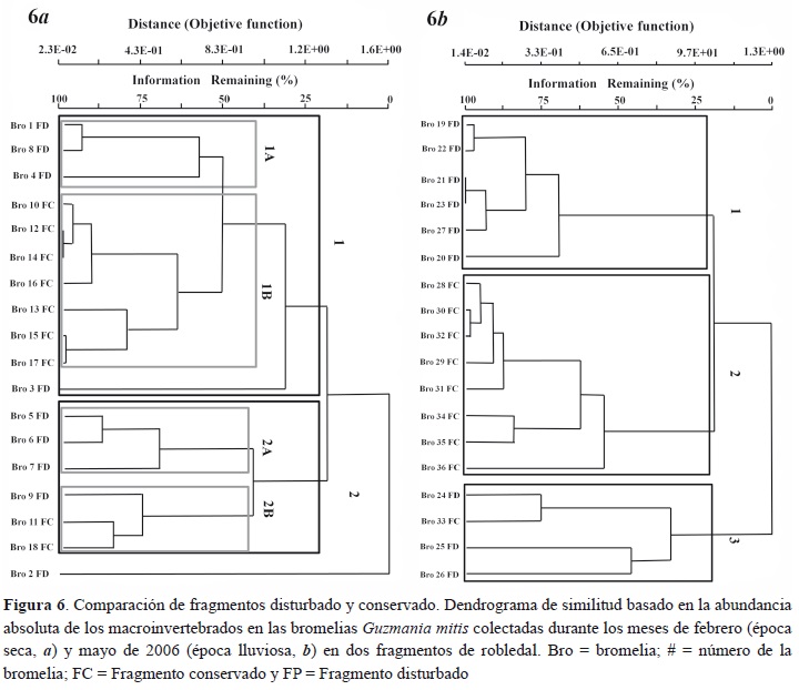 En la figura 6a se muestran los dendrogramas usando las abundancias de macroinvertebrados de las bromelias colectadas en la temporada seca, en donde se observan dos grandes grupos de bromelias y dos grupos conformados por una sola bromelia. El primer grupo (1) es separado por poseer un menor número de Chironomidae, este se divide en un subgrupo 1A del FD, con menor número de larvas de Scirtidae, y el subgrupo 1B del FC se destaca por una mayor abundancia de individuos de Scirtidae. La bromelia 12 FC presenta semejanzas con las bromelias 10 y 14 del FC en el número de Chironomidae, Scirtidae y Syrphidae morfoespecie 2 (Mf 2), y se agrupa finalmente con la bromelia 14 FC, con un porcentaje de similitud muy alto, debido a que presentaron una cantidad parecida de Acari mf 5. El segundo grupo (2) se caracterizó por tener una mayor abundancia de Chironomidae, está conformado por el subgrupo (2A) del FD, con una mayor abundancia de copépodos; otro subgrupo (2B), sin o con muy pocos copépodos, presentó la mayor abundancia de Chironomidae de todas las bromelias.