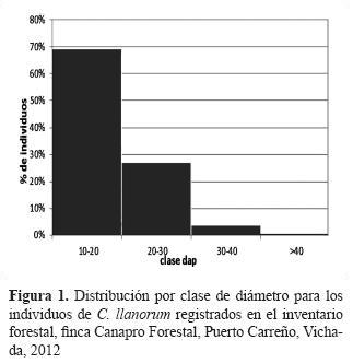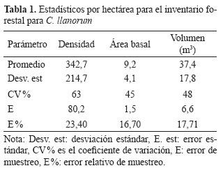 El inventario forestal reportó un promedio de 342 árboles por hectárea y un volumen de 37,4 m3·ha-1 para C. llanorum, se incluyen árboles con dap ≥10 cm; estos parámetros resultaron ser heterogéneos debido probablemente a la notable diferencia entre las densidades encontradas en las parcelas (tabla 1). Las estimaciones de los promedios presentan una precisión aceptable, al observar el E%. Como se muestra en la tabla 1, los resultados para el volumen por hectárea son bajos si se tiene en cuenta la densidad reportada para el rodal, la cual coincide con lo reportado para bosques de la cuenca del Orinoco (Lampretch, 1990).