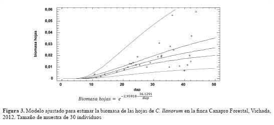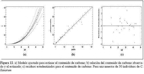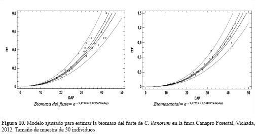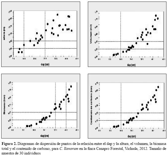 El contenido de carbono para cada árbol de la especie C. llanorum está dado por la relación ; los estadísticos calculados para esta ecuación son similares a los que presentaron las ecuaciones ajustadas para la biomasa del fuste y la biomasa total; esto se debió a que en el fuste se encuentra concentrado el mayor porcentaje de biomasa del árbol, de esta manera se determinan los modelos que más se ajustan para establecer el contenido de biomasa total, lo que coincide con el mismo modelo utilizado para estimar la biomasa total aérea que ajustaron Montero & Kanninen (2002) y Díaz et al. (2007).