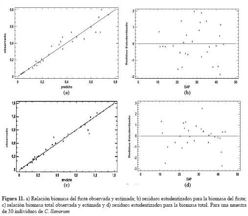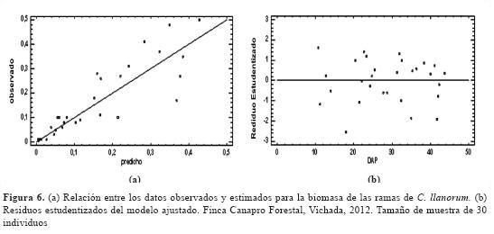 En la figura 6a se observa cómo los puntos que representan la relación entre los datos observados y los estimados por el modelo se ubican cerca de la recta, lo cual muestra que los valores estimados para la biomasa de las ramas son estadísticamente confiables. Para el compartimento de las ramas, hay un residuo estudentizado mayor que 2, pero no mayor que 3, lo que significa que la mayor parte de los residuos se encuentran agrupados cerca a la media de los datos observados y que no existen datos atípicos estimados, para este caso tampoco se ve un patrón de dispersión para los datos de los residuos (figura 6b). Con respecto al volumen y la biomasa del fuste, se ajustaron 27 modelos y se escogieron los tres mejores, teniendo en cuenta la calidad estadística de estos (tabla 3).
