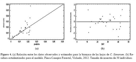 Los análisis de regresión y correlación al igual que los de residuales mostraron que el volumen total y la biomasa aérea total dependen en un alto grado del diámetro de los individuos de la especie estudiada, aspecto que se pudo evidenciar durante el ajuste de los modelos. El FEB no mostró relación con ninguna variable que permitiera la construcción de un modelo de predicción de este, lo cual coincide con los resultados presentados por Montero & Kanninen (2002); además, se observó que el FEB para la especie fue de 1,54, lo que indica que C. llanorum es una especie con una baja densidad de copa si se compara con lo reportado para otros bosques tropicales (Brown & Lugo, 1984), el cual fue de 1,6.