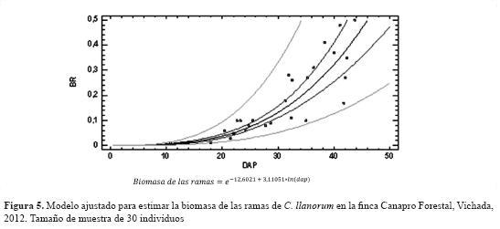 Para la biomasa de las ramas, la mejor ecuación consideró como variable independiente el dap en centímetros, lo que arrojó un coeficiente de determinación (r2) de 0,90, que indica que el modelo ajustado explica una buena proporción (90 %) de la variabilidad de los datos de la biomasa de las ramas, como lo indican Segura & Andrade (2008). Además, fue el modelo que reportó un menor valor para el error estándar (0,432), así como para la suma de cuadrados de los residuos PRESS (0,187) (figura 5).