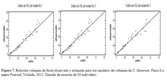El análisis de varianza (Anova) no reportó diferencias significativas entre los valores estimados por las tres ecuaciones y los datos observados para volumen del fuste con un nivel de confiabilidad del 100 %. La figura 7 muestra las relaciones entre los valores estimados y los observados, empleando los tres modelos, según lo recomendado por Segura y Andrade (2008); como se puede observar, los puntos se agrupan a lo largo de las rectas para los tres casos; se muestra una mayor cercanía de los datos a la recta para la gráfica del modelo 3, que corresponde a un modelo multiplicativo con r2= 0,98, lo que indica que el dap explica estadísticamente un 98 % de la variación del volumen del fuste (Vf) de acuerdo con lo que indican Kometter & Maravi (2007).
